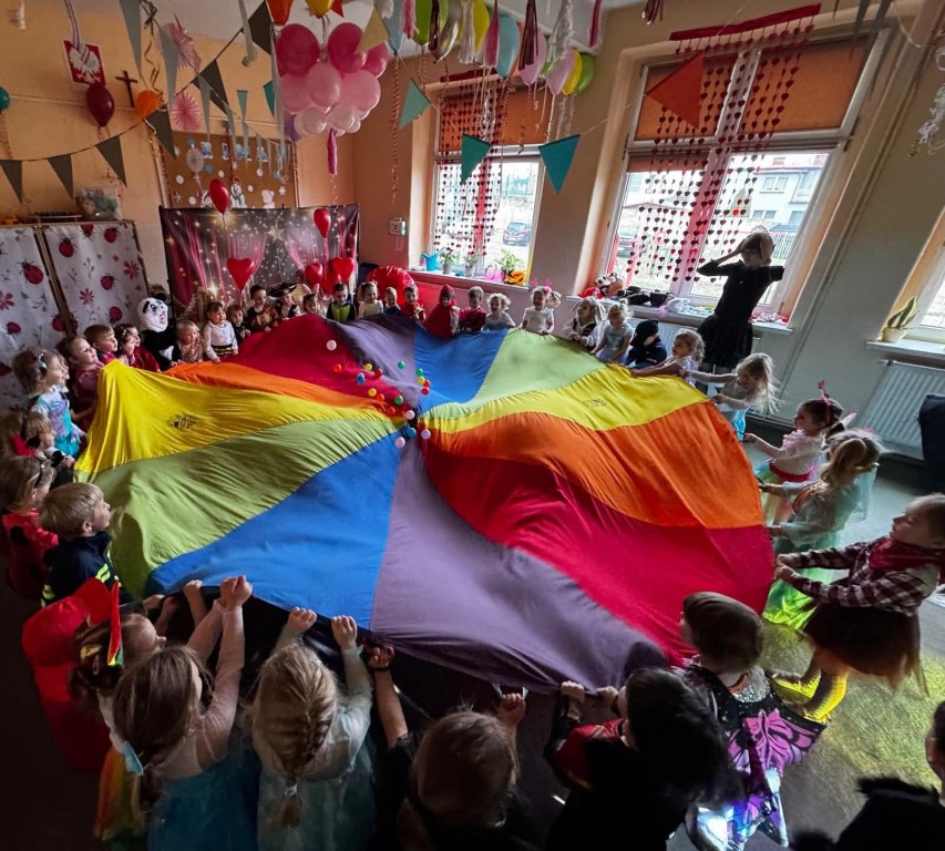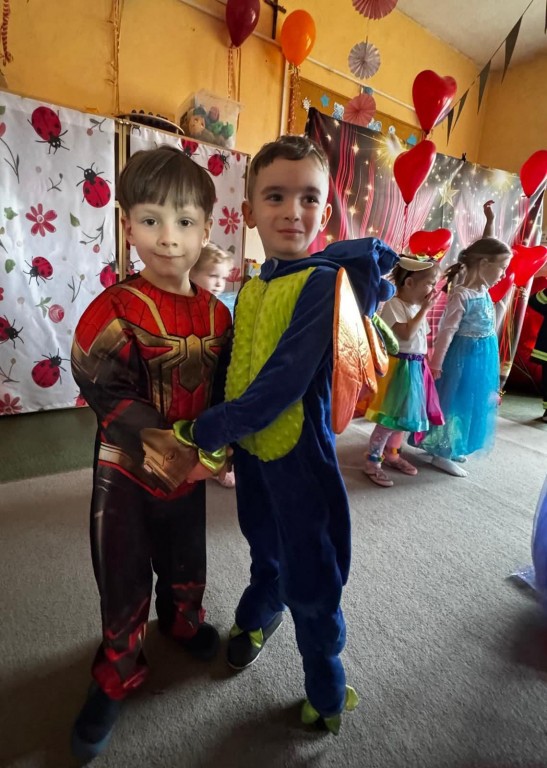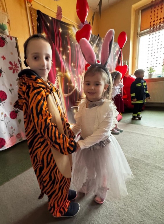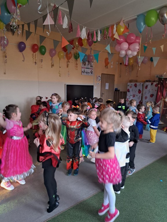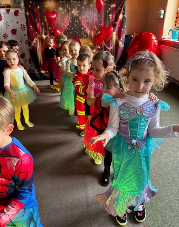 W naszym przedszkolu odbył się długo wyczekiwany bal karnawałowy. Tego dnia sala przedszkolna zamieniła się w kolorową, bajkową krainę pełną radości, muzyki i uśmiechów. Dzieci przybyły w pięknych, pomysłowych strojach – można było spotkać księżniczki, superbohaterów, zwierzątka oraz postacie z ulubionych bajek.